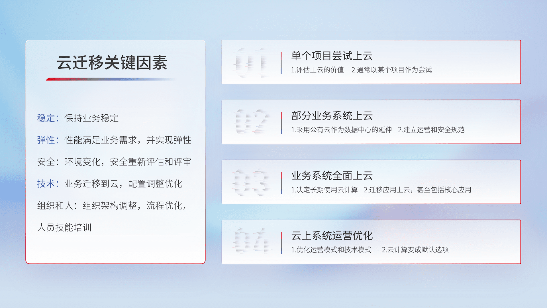 结合实际业务,,从规划设计、、云平台选型、、、、云原生改造、、、、数据迁移、、、、集成交付,,,迁移全过程为客户识别最佳上云路径,,,做好风险识别管理,,,设计网络架构、、身份权限、、、、安全审计合规、、、、操作审计、、、、日志审计、、、监控告警策略、、、多站点容灾设计等,,对云上基础设施进行整体规划,,提升IT治理水平,,,,以满足弹性、、高可用、、高性能的需求。。。