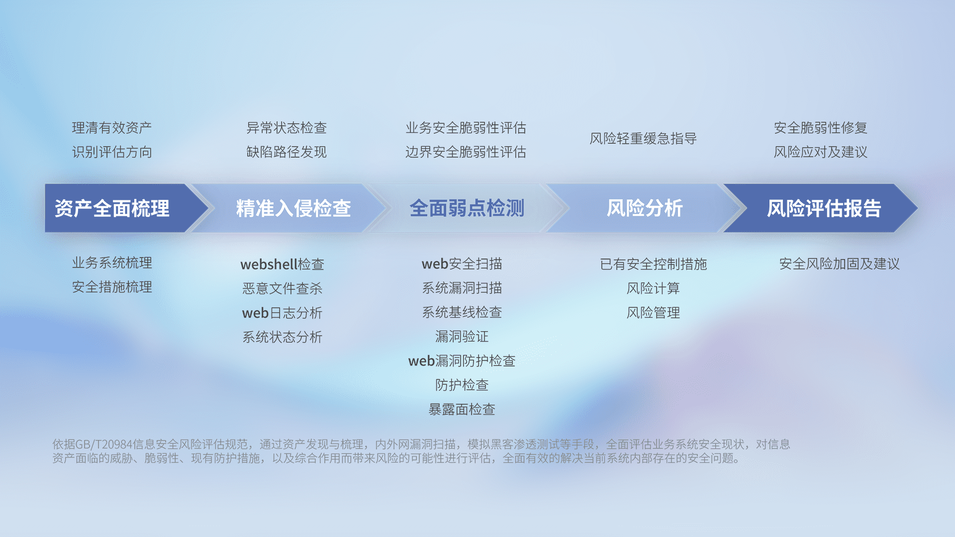 针对客户行业特性,,,以专业的安全服务+多厂商联合解决方案提供专属的一站式安全管理服务,,,帮助客户全面感知网络空间威胁,,,,基于识别、、检测、、、、分析、、、防护、、监测、、响应的服务理论模型,,从方案咨询、、集成交付、、、、评估验证、、、优化加固、、、、运维运营,,,,致力于为客户提供完整的闭环管理式安全服务。。。以实战经验为客户打造高抵御风险的安全体系,,帮助客户发现威胁、、、对抗威胁、、、、处置威胁,,,不断积累安全对抗能力,,,持续保障数字化安全。。